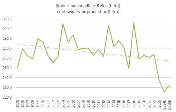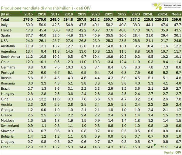 OIV ha rilasciato la prima stima di produzione mondiale di vino per il 2025, con una previsione di 228-235 milioni di ettolitri, che nel punto mediano la piazzano circa il 3% sopra il 2024, che però era stato il minimo storico. Ora, forse c’è da essere rincuorati nel leggere questi dati perché è meglio produrre meno, visto l’andamento calante dei consumi. Infatti, con consumi ora stimati intorno a 215 milioni di ettolitri e 25-30m/hl impiegati per altri usi, una produzione di 230 milioni di ettolitri è forse leggermente corta, ma un toccasana per ridurre le scorte e tenere i prezzi.