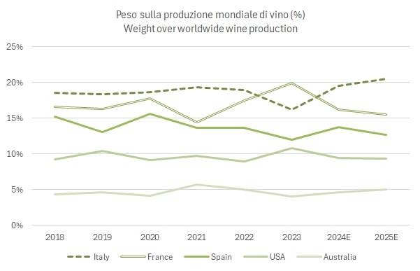 • Restano sotto la media anche gli USA con 22 milioni di ettolitri, -13%, mentre sono in recupero i dati dell’Australia a 11,6 m/hl, +11% sul 2024 ma il 5% sotto la media. L’Argentina è quasi stabile rispetto al 2024, ma l’8% sotto la media storica.