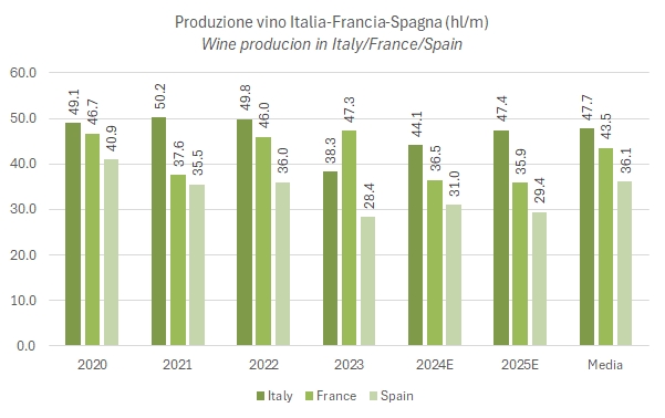 • Noi siamo più interessati alle singole nazioni. Abbiamo parlato dell’Italia, che viaggia sulla media a 10 anni, mentre la Francia, con 36 milioni di ettolitri previsti, e la Spagna, con 29 milioni, sono il 18% sotto la media storica.