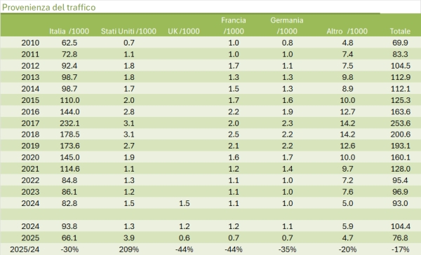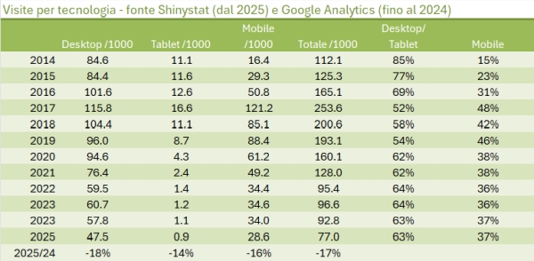 - Il blog chiude il 2025 con 77mila visite, in calo del 26% rispetto alle 104mila rilevate da ShinyStat per il 2024 (erano 93mila rilevate nel 2024 da Google Analytics). Le fonti sono diverse ma abbastanza sovrapponibili tra loro. A proposito: ho dato l’addio a Google Analytics, la cui nuova interfaccia è diventata, secondo me, difficilissima da usare per chi, come me, ha soltanto l’obiettivo di contare quante persone accedono al sito.