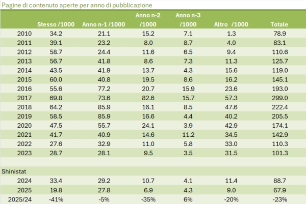 I numeri sono impietosi: le visite al blog calano del 26%, le pagine viste del 26% anche loro, il tempo medio passato da ciascun visitatore sul sito cresce del 35%. Dato ancora più negativo: le visualizzazioni di pagina dei contenuti pubblicati nel 2025 sono il 41% inferiori a quelle del 2024.