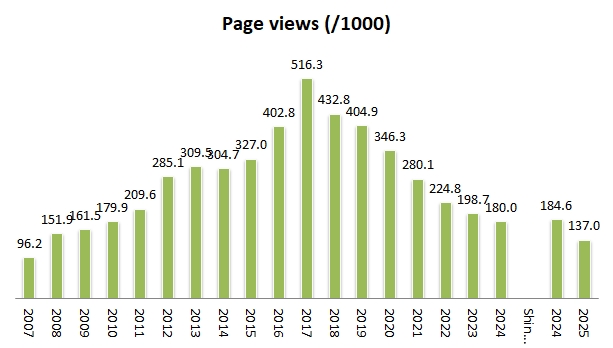 Il 2025 è stato un anno decisamente negativo dal punto di vista dell’audience del blog, nonostante una serie di accorgimenti volti a invertire la tendenza. Primo tra tutti, l’aumento delle pubblicazioni sul blog: 163 rispetto a 157 dello scorso anno, grazie al contributo di Emanuele. Secondo, a partire da ottobre 2025, l’eliminazione della pubblicità di Google AdSense, che ha fortemente migliorato la fruibilità del blog, senza interruzioni, al costo di rinunciare a un incasso annuo poco superiore a 100 euro (su cui, in teoria, andrebbero anche pagate le tasse).