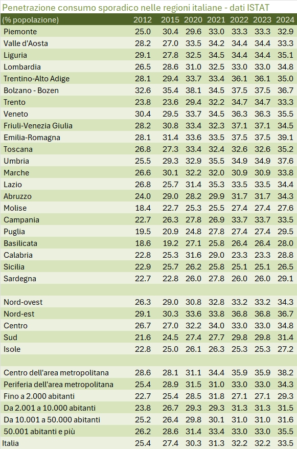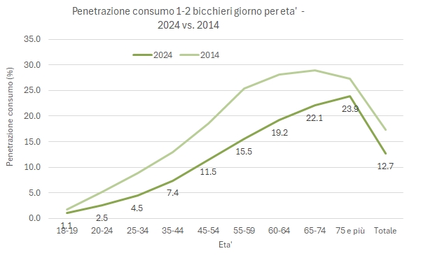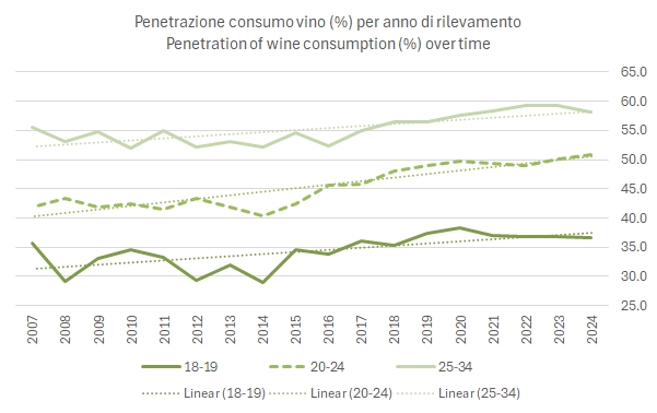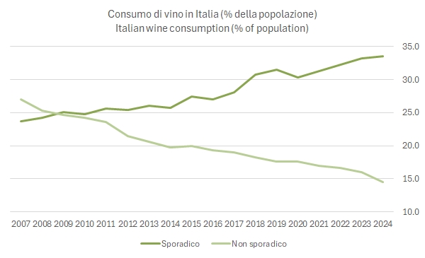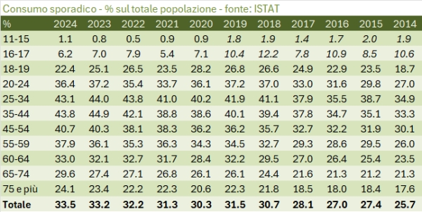 Anche il consumo sporadico, strutturalmente in crescita, sebbene lo sia anche nel 2024, sembra stabilizzarsi. Addirittura, proprio nelle fasce di età più giovani.