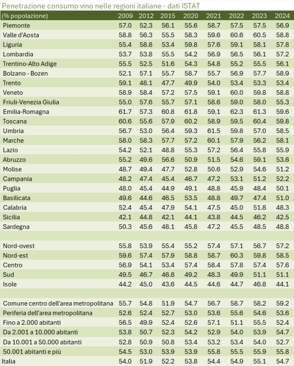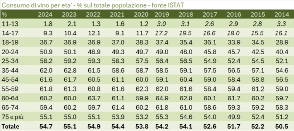 Torniamo sul tema del consumo di vino per occuparci dei dettagli per età dei consumatori e per regione di consumo nel 2024. Stiamo parlando dei dati ISTAT, che non quantificano il consumo in ettolitri, bensì la percentuale della popolazione che consuma vino.