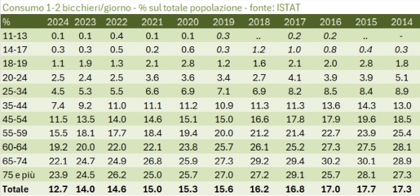 Il contesto lo conosciamo: i consumi di vino calano. Pochi minuti fa scrivevo delle vendite nella GDO: se la “quota di mercato” della GDO è rimasta stabile nel 2024, i consumi in ettolitri sono scesi dell’1.1% (-2.1% nel 2025, quindi anche peggio). Il dato ISTAT ci dice che in Italia il 54.7% della popolazione ha consumato vino, contro il 55.1% dello scorso anno. Ben sappiamo che il modello di consumo si orienta verso una frequenza non giornaliera (33% della popolazione, contro il 15% del consumo abitudinario).