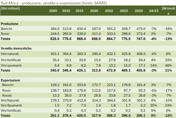 Il 2024 conferma il ridimensionamento del vino sudafricano: la produzione scende a 7.5 milioni di ettolitri, -4% rispetto al 2023 e del 13% circa sotto la media dei 5 anni precedenti. Il calo è anche frutto della riduzione graduale della superficie vitata, pari a -1% anche nel 2024, a 86mila ettari. Per confronto, erano 102mila del 2005 (-15%) e 92mila nel 2020. Il calo rispetto al 2020 è uniforme tra i vini bianchi e quelli rossi. Sauvignon Blanc e Pinotage sono i vitigni che tengono o crescono.