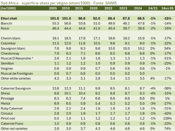 - Infine, uno sguardo alle superfici vitate, che piano piano si abbassano. Siamo a 86500 ettari, -1% nel 2024 e -15% rispetto al 2005. Nel 2024 si sono persi 300 ettari di bianchi e 900 di rossi. Nel segmento dei bianchi cresce soltanto il Sauvignon Blanc, che passa a 10200 ettari (+2%), mentre il principale vitigno, lo Chenin Blanc, resta stabile in proporzione al vigneto totale, perdendo 300 ettari, a 15900. Nei rossi, tutti i vitigni sono in calo salvo il Pinotage, stabile a 6600 ettari.