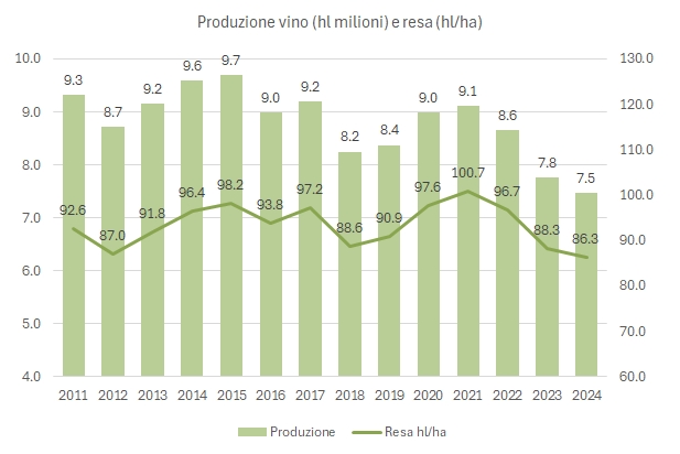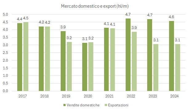 Il quadro commerciale rimane strutturalmente più orientato verso il mercato interno, come è giusto che sia: le vendite domestiche totali (naturali + spumanti + fortificati) sono 4,6 milioni di ettolitri nel 2024 (-3% sul 2023 ma +11% rispetto alla media, fallita dall’anno del Covid), mentre le esportazioni si fermano a 3 milioni di ettolitri, stabili rispetto al 2023 ma ben sotto il picco di oltre 4 milioni toccato tra il 2010 e il 2020.