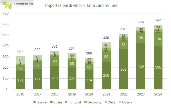 Le importazioni italiane di vino stanno gradualmente cambiando faccia. Lo si vede molto bene anche dai dati 2024, che evidenziano un incremento dell’import del 3% a 592 milioni. Il dato dei volumi è molto forte (+45% a 3.1 milioni di ettolitri) e probabilmente fuorviante, rispetto a quello che vedo “sotto i dati”, essendo molto legato ai volumi di vino sfuso importato, che a sua volta si livella in base all’andamento delle nostre vendemmie (quando abbiamo poco vino dobbiamo importarne di più).