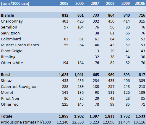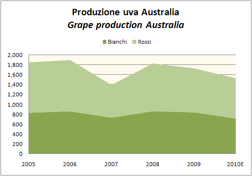 Per fortuna degli australiani la vendemmia 2010 sara’ in calo di oltre il 10% rispetto allo scorso anno e decisamente al di sotto della media storica (circa il 12% sotto il livello degli ultimi 5 anni di circa 1.75 milioni di tonnellate). La stima ormai quasi definitiva parla di 1.5m/ton di uva vendemmiata che dovrebbero dare luogo a una vendemmia di circa 10 milioni di ettolitri, il 12% in meno rispetto allo scorso anno. Visto il cattivo andamento delle vendite di vino e la crisi dei grandi produttori dell’area si spera che cali cosi’ vistosi possano in realta’ continuare. Se nel 2009 a soffrire di piu’ furono i vini rossi, nel 2010 e’ successo esattamente il contrario, con un crollo del 15% della produzione di uve bianche a 716mila tonnellate a cui fa da contraltare una riduzione dell’8% dei rossi a 817mila tonnellate.