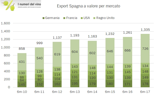 La Spagna riprende a crescere nell’export nei primi 6 mesi del 2017 (+6% a 1335 milioni di euro), dopo un anno sottotono. Lo fa interamente con il miglioramento del mix, dato che i volumi sono rimasti stabili a 11.6 milioni di ettolitri. A differenza di quanto si potrebbe immaginare a prima vista il mix migliore non implica un calo delle esportazioni di vino sfuso, anzi: a trainare le esportazioni sono proprio i vini sfusi, insieme a un rinnovato vigore dei vini spumanti. Dal punto di vista dei paesi, Cina, Francia, USA e Canada sono i mercati che stanno sostenendo le esportazioni spagnole nel segmento dei vini fermi imbottigliati, mentre nel segmento degli spumanti è il mercato tedesco a sostenere i vini spagnoli, altrimenti colpiti, come già nel 2016, dal calo del mercato inglese. Passiamo ai dati di dettaglio.