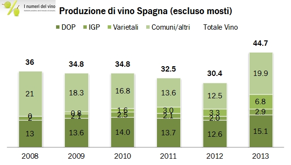 Quando si mettono in ordine le carte si trova sempre qualcosa da fare, che è rimasto indietro. E’ il caso della produzione di vino spagnola, che oggi commentiamo e aggiorniamo al 2013, grazie ai dati molto dettagliati rilasciati dal ministero dell’agricoltura spagnolo. Come chi legge conosce bene, la Spagna è “strutturalmente” la terza forza del vino nel mondo dopo la Francia e l’Italia. Ha una superficie viticola molto rilevante, con rese relativamente basse. La produzione di vino media degli ultimi anni è stata intorno ai 35 milioni di ettolitri, con un picco proprio toccato nel 2013 a 44.7 milioni di ettolitri, raggiunto grazie a una combinazione di meteo favorevole e innovazioni tecnologiche (leggi irrigazione e tecniche di produzine). Come dicono gli spagnoli: abbiamo la superficie vitata più estesa del mondo…. A ciò si sono aggiunti mediamente circa 5 milioni di ettolitri di mosti (pre concentrazione), che portano il potenziale produttivo medio degli ultimi 5 anni a circa 40 milioni di ettolitri. Peraltro, come abbiamo anticipato sopra, il 2013 ha chiuso tra vini e mosti a circa 52 milioni di ettolitri e il 2014, secondo le prime stime dell’OIV, è un altro anno sopra media, intorno a 37 milioni di ettolitri di solo vino, quindi presumibilmente 42-43 milioni compresi i mosti. L’altro punto rilevante di questi dati è il forte progresso fatto segnare dalla Spagna nella promozione dei vini varietali (che noi italiani non rileviamo nemmeno), che hanno raggiunto nel 2013 una quota del 15% della produzione di vino “togliendoli” dalla svalutante categoria dei vini comuni… passiamo ai dati