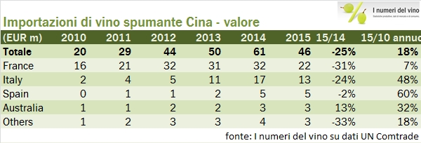 Dati controllati e ricontrollati, facendo il controllo incrociato con le esportazioni e con i dati pubblicati dal Corriere Vinicolo. Ci sono leggere differenze qua e là ma la sostanza del discorso non cambia: le importazioni di vino in Cina hanno ripreso a correre nel 2015, sia che le calcolate in Euro, come facciamo in queste tabelle, che le lasciate in dollari. Il totale 2015 fa 1.83 miliardi di euro, +62%, oppure 2.04 miliardi di dollari, +36%. L’Italia porta a casa 91 miloni di euro, il 16% in più del 2014 che però è in leggero calo (-3%) se letto in dollari americani. Decisamente un cattivo risultato, considerato che gli spagnoli sono cresciuti del 40% e tutti quelli che vengono prima, francesi, cileni e australiani, sono cresciuti anche di più. Una ulteriore stranezza di questi dati è il calo delle importazioni cinesi di spumante, sceso del 10% a 55 milioni di euro; entrambi i numeri ci dicono di quanto sia irrilevante questa categoria per il mercato cinese, il che aiuta anche a spiegare come il vino italiano (spinto soprattutto dalle esportazioni di spumante) faccia fatica… Andiamo a leggere qualche numero insieme.