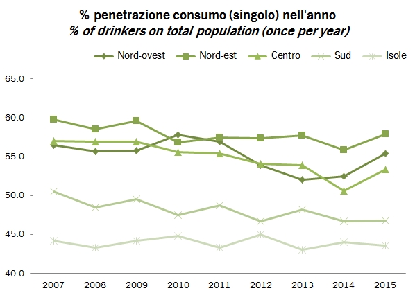 Proseguiamo l’analisi del consumo di alcolici e vino in Italia con l’approfondimento sulle aree geografiche e sulle fasce di età. Le conclusioni dei dati generali, che vedevano un calo della penetrazione del consumo di vino (e un incremento di quelle della birra e degli altri alcolici), oltre a un calo del consumo sporadico (sempre in crescita in passato), sembrano essere un po’ meno preoccupanti una volta approfonditi tra le fasce di età. Sarà una percezione, però il calo della penetrazione del consumo sembra essere più visibile tra gli ultra 55enni e meno preoccupante tra i giovani. Se escludiamo la fascia 25-34 anni notiamo che lo stesso vale largo circa per il consumo sporadico di vino, dove il leggero calo del 2016 sembra più legato a un dato quasi anomalo del 2015 rispetto agli andamenti storici. I dati regionali sono anch’essi piuttosto volatili. Secondo ISTAT nel 2016 aumenta in modo visibile la penetrazione del consumo di vino in Puglia, Lazio, Friuli Venezia Giulia, Trento e Valle d’Aosta, mentre sono negativi i dati nelle tre regioni chiave del nord, Piemonte, Lombardia e Veneto, così come in Abruzzo, Calabria e Sardegna. Passiamo a commentare qualche numero insieme.