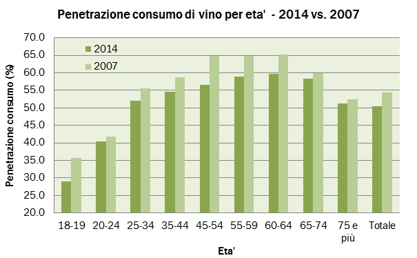 Torniamo sul tema dei consumi di vino con un’analisi, che sta diventando sempre più ricca, delle principali tendenze al consumo di vino. Nell’ambito di un generalizzato calo del consumo, esistono apparentemente delle isole felici (o meno infelici) come per esempio Bolzano, dove la penetrazione del consumo quasi quasi aumenta, e fasce di età come quella dei ventenni dove la compressione del consumo sembra essere meno spinta. Lo stesso può dirsi per le grandi città (meno afflitte dal fenomeno del calo di consumo) rispetto ai piccoli centri. Sono dati che “tagliando” la popolazione in modo così netto restano volatili, ma alcune tendenze di lungo termine possono essere colte. Due numeri prima di obbligarvi a cliccare per continuare a leggere. Le regioni del Nord viaggiano intorno al 53-55% di bevitori sulla popolazione, contro il 44-47% delle regioni del sud. Quindi siamo intorno a 10 punti di penetrazione. Secondo, la curva di penetrazione del consumo per età si sta “schiacciando”: oggi sopra i 25 anni la penetrazione varia tra il 52% e il 60%, il minimo storico: fino al 2012 i dati mostravano un “gap” tra chi beveva meno di oltre 10 punti. Ma andiamo ai dati di dettaglio.