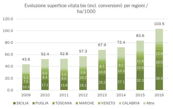 La corsa delle vendite di prodotti biologici non si ferma, anzi accelera a guardare i dati prodotti da Sinab e riferiti al 2016. Così anche per il settore del vino, dove la superficie coltivata secondo metodi bio ha superato quota 66mila ettari (qui incluso sono circa 2000 ettari di uva da tavola), quindi quasi l’11% della superficie vitata e altri 37mila sono in conversione, per un totale di 103mila ettari, quindi potenzialmente il 17% circa della superficie italiana. Il balzo del 2016 è notevole, del 25% circa, e segue la logica della domanda e delle vendite che sono cresciute del 41% nella GDO italiana nel 2016, addirittura raddoppiando (+110%) nel primo semestre 2017. A guidare la classifica delle superfici bio sono in termini assoluti tre regioni italiane: Sicilia, Puglia e Toscana, mentre penetrazione più elevata in relazione alla superficie totale si riscontra soprattutto nelle regioni del meridione. Visto l’incremento della domanda e il balzo delle superfici in conversione, vedremo ulteriori progressi nel futuro. L’Italia è avanzatissima anche a livello europeo. Secondo i dati dell’agenzia bio francese, la penetrazione bio in Italia supera quella di tutti gli altri paesi (la Spagna è all’11%, la Francia al 9% e la Germania all’8%) mentre in termini di superficie totale siamo leggermente dietro la Spagna (106mila ettari). Ma intanto passiamo a commentare i dati regionali italiani, che trovate dettagliate nelle tabelle contenute nel resto del post.
