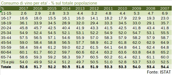 Eccoci al post che dà granularità (parola che odio ma di uso sempre più comune) ai dati di penetrazione del consumo di vino 2017 (e degli anni precedenti) pubblicati da ISTAT. Abbiamo oggi una bella serie storica, sia dei consumi per età che di quelli regionali: qualche confronto diventa oggi sensato. Per esempio, da queste tabelle si evince che i 45-54enni nel 2017 che bevono vino erano il 59% della popolazione. Dalla tabella si evince che nel 2007 i 34-44enni (cioè le stesse persone) che bevevano erano il 58.7%. Quindi nessuno incremento della penetrazione di consumo oltre i 40 anni. O bevi già vino prima oppure niente. Invece i trentenni di oggi che bevono vino sono il 55% della popolazione. Otto anni fa questi consumatori facevano parte della fascia di età 20-24 e stavano al 42%. Potremmo quindi cominciare a disegnare la curva dove, oltre naturalmente alla fase di raggiungimento della maggiore età, la penetrazione di consumo cresce in modo deciso soltanto fino a 30, poi qualche progresso fino ai 40enni e poi basta. E poi si scende. I 70enni del 2017 che bevono sono il 59% della popolazione, ma quanto bevevano prima? Beh 8 anni fa erano in mezzo alla fascia 60-64 che aveva una penetrazione del 64%. Questo e altro ancora trovate nelle tabelle allegate al post. Il trend fondamentale è sempre quello della crescita del consumo sporadico di vino, per tutte le fasce di età. Ma un secondo dato mi pare interessante e doveroso di attenzione: il 46% dei 20-24enni di oggi dichiara di bere vino, mentre erano soltanto il 42% dieci anni fa, e questo dato ha preso a crescere proprio negli ultimi 3-4 anni. Un buon segno, decisamente, per il settore. Passiamo ai numeri.