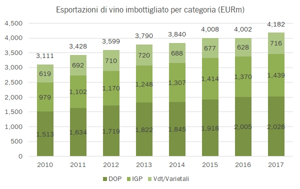 Avendo in mente l’incremento del 4.5% dell’export di vini fermi in bottiglia, il 2017 è stato decisamente l’anno dei vini varietali e da tavola (+23% e +13%, ma partendo da valori molto esigui) e dei vini IGT (+5%), mentre per i DOP la crescita si è limitata all’1%. A livello regionale si è confermato il calo per i prodotti DOP veneti (-5%), mentre continua la crescita forte dei prodotti del Trentino (+9%, soprattutto bianchi) e, bisogna sottolinearlo, dei vini rossi piemontesi DOP (+7%).