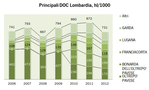 Come forse è accaduto anche per altri comparti dell’economia reale, in Lombardia non si è mai registrata una vera e propria crisi di produzione vinicola. La vendemmia 2013 è stata molto abbondante come nel resto d’Italia ma la proporzione con il passato non è così eclatante: rispetto all’anno scorso ISTAT registra un incremento produttivo del 6% contro il +18% del dato nazionale. Continua piano piano la focalizzazione sulla qualità, ultimamente perseguita attraverso l’intensificazione dell’uso delle IGT, mentre la proporzione tra vini bianchi e rossi sembra essersi stabilizzata vicino alla parità. Leggiamo insieme i dati.