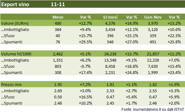 Novembre e’ stato un altro mese eccellente per l’export italiano. I vini sfusi, che avevano dato segni di cedimento hanno avuto un buon mese, mentre i numeri per i vini imbottigliati e spumanti sono piuttosto allineati ai mesi precedenti, cioe’ con una crescita intorno al 9-10% per i primi e vicino al 30% per i secondi.