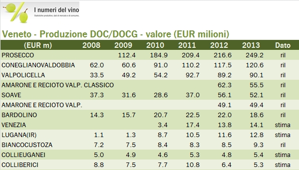 Dopo Toscana e Piemonte procediamo con l’analisi delle DOC regionali in Veneto, dove dominano per volumi e valore due aree/vini: la Valpolicella e il Prosecco. Le nostre stime su volumi 2013 e prezzi 2014 ci indicano un valore alla produzione di 370 milioni di euro per l’accoppiata Conegliano Valdobbiadene e Prosecco, e di circa 200 milioni di euro per Valpolicella/Amarone. Sono numeri particolarmente rilevanti, anche nel panorama italiano: considerando i 17.3 milioni di ettolitri DOC prodotti nel 2013 e il prezzo medio italiano di 130 euro per ettolitri, otteniamo 2.2 miliardi di euro. Ecco, di questi 570, cioè il 25% sono di quei due “gruppi” di denominazioni. Passando ai numeri sui volumi di Federdoc, secondo l’agenzia i volumi DOC del 2013 sono cresciuti dell’8% a 4.7 milioni di ettolitri (comprese DOC interregionali). Accanto al +19% del Prosecco, che sfonda la ragguardevole barriera dei 2 milioni di ettolitri, tra le grandi denominazioni venete il 2013 è stato buono per il Valpolicella (+7%), meno per l’Amarone (-6%) e per il Bardolino (-15%), mentre sono poco mossi i numeri del Conegliano Valdobbiadene (+3%) e del Soave (-2%). Andiamo sui numeri. Continua a leggere »