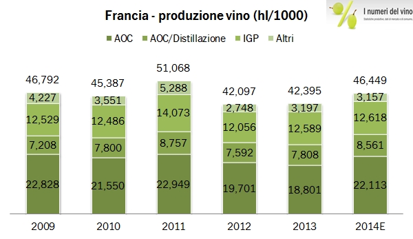 Agreste ha rilasciato i dati definitivi sulla produzione di vino in Francia del 2013, che accoppiamo alle più recenti stime di produzione 2014. Dopo due anni di vacche magre, con una produzione di vino del 7% circa sotto la media storica e con l’aggravante di un ammanco concentrato nei vini di qualità, il 2014 ha visto un rimbalzo importante della produzione, che dovrebbe essersi attestata sopra 46 milioni di ettolitri (includendone 8 che vengono poi distillati), cioè il 4-5% sopra la media storica degli ultimi anni. Questo dovrebbe anche essere il “normale” potenziale produttivo francese, dato che il calo della superficie vitata si è fortemente attenuato dopo l’esaurimento degli incentivi all’espianto promossi dalla comunità europea. Passiamo ad analizzare i dati.