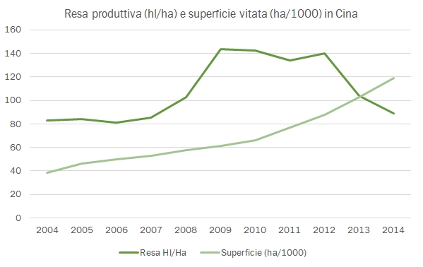 France Agrimere ha fatto un buon lavoro di raccolta di una serie di dati sul mercato e produzione di vino in Cina, che da sempre rappresentano un punto di domanda per la maggior parte degli operatori. In verità neanche questi dati riescono a essere del tutto convincenti, ma cominciano a fornirci qualche tendenza di massima e qualche informazione in più sulla produzione di vino che nel 2014 si svolgeva su 121400 ettari con una resa di circa 88-89 ettolitri a ettaro per una produzione di vino locale cinese di poco inferiore a 11 milioni di ettolitri. Non è stato il record, toccato invece nel 2012 quando la produzione ha superato i 12 milioni di ettolitri. Le torte allegate vi danno anche ragione del tipo di produzione, soprattutto vitigni internazionali (Cabernet Sauvignon in testa) e soprattutto rossi (90%). Passare dalla produzione al consumo non è semplice, anche se non essendoci a quanto sembra scorte e essendo l’export molto limitato, si bevono quello che producono più quello che importano… cioè tra il 2013 e il 2014 qualcosa tra 16 e 17 milioni di ettolitri. Essendo 1.3 miliardi di persone, ancora un prodotto di nicchia nel paese… andiamo a leggere qualche dato insieme.