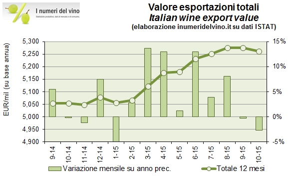 Ottobre e’ il secondo mese consecutivo in cui le esportazioni di vino scendono, per quanto marginalmente (-3%). La differenza con il mese precedente e’ relativa al fatto che tutte e tre le categorie hanno davanti il segno negativo: nel segmento degli spumanti il segmento dei DOP resta in crescita, ma soltanto del 6%. Cio’ non e’ sufficiente a compensare il crollo delle esportazioni di Asti, che si sono acuite a -33% in ottobre. Si sta verificando una stabilizzazione (su livelli piu’ elevati che in passato) del prezzo medio di export, probabilmente anche grazie ai cambi, che pero’ non e’ piu’ sufficiente a compensare la debolezza dei volumi, continuata negli ultimi mesi (-2.5% da inizio anno). Ottobre e’ con luglio il mese piu’ importante dell’anno per l’export di vino e questo chiaramente non e’ un buon segnale, anche se come ci siamo detti diverse volte e’ piu’ facile fare bene nei mesi scarichi che in quelli pesanti… andiamo a leggere qualche numero insieme…