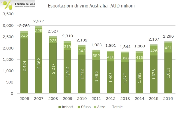 Questo è il primo anno dopo molti in cui la lettura delle esportazioni di vino australiano non è complicata dai rapporti di cambio. Come al solito, leggiamo i numeri nella valuta locale, dollari australiani: l’export è cresciuto del 6% a 2.3 miliardi. Il dato in dollari americani è 1.7 miliardi, +5%, quello in Euro 1.54 miliardi di euro, +5.5%. Da qualunque lato si guardano i numeri, è stato un buon anno per gli australiani, il secondo positivo in valuta locale. L’incremento è stato bilanciato tra volumi (+3%) e prezzo medio di esportazione (+3%) ed ha come principale protagonista il mercato cinese, cresciuto del 42% nel 2016 nella Cina continentale e del 27% se includiamo anche Hong Kong (in leggero calo). Nel 2016 questi due mercati sono il 28% delle esportazioni di vino australiano, erano il 10% nel 2010: prossimità geografica, vitigni internazionali e, soprattutto, forza commerciale di alcuni player importanti, hanno fatto la fortuna del prodotto australiano. Il rovescio della medaglia è evidente: se l’export fa +6% e la Cina +42% vuol dire che va male quasi da tutte le altre parti… e in effetti questo è proprio quello che ci dice la tabella. Dunque, i dati sono positivi ma bisogna fare attenzione perché quando c’è un solo motore si rischia. Passiamo ai dati.