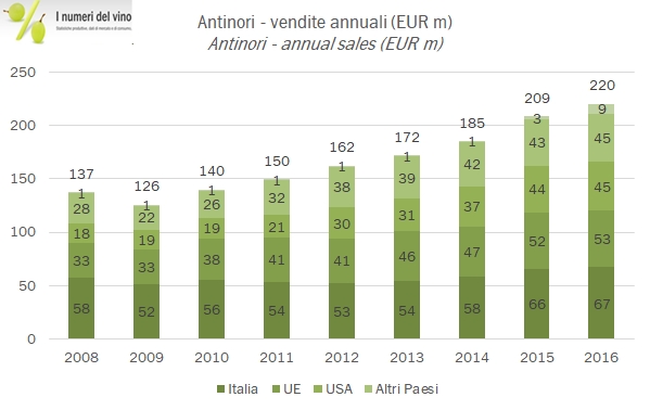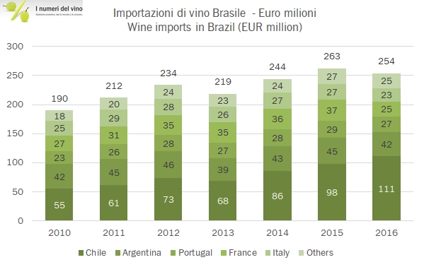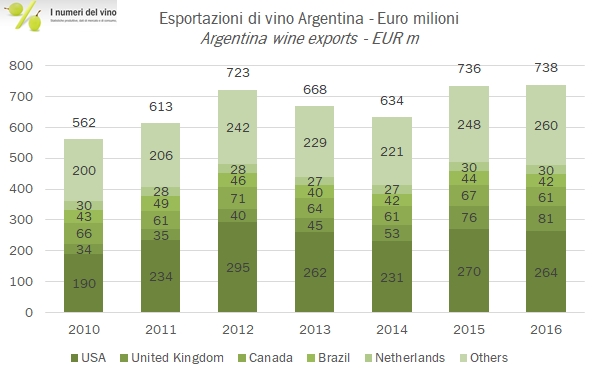 Le esportazioni di vino argentino sono rimaste stabili nel 2016 in euro intorno a 738 milioni, che sarebbe poi il livello più elevato di sempre. Questo “record” si compone in realtà di due trend opposti: il calo dell’export di vino sfuso, ormai soltanto l’8% delle esportazioni, rimpiazzato da esportazioni di vino in bottiglia, che invece crescono del 2% anche nel 2016, e mantengono un andamento saldamente positivo nel corso degli ultimi anni (+5%). Anche se la crescita degli anni scorsi è ormai un ricordo, il vino argentino resiste nel mercato americano e cresce nel mercato inglese, perdendo invece terreno in Canada e Brazile, che comunque rivestono un ruolo marginale quando si guarda ai numeri. Il peso argentino è letteralmente crollato nel 2016, passando da 9.2 a 14.75 contro il dollaro. Questo determina un incremento degli incassi in valuta locale in crescita del 60% (rispetto alla stabilità che vediamo nei dati in euro), ma questo va di pari passo con i forti trend inflazionistici nei costi di produzione. Passiamo ai dati.