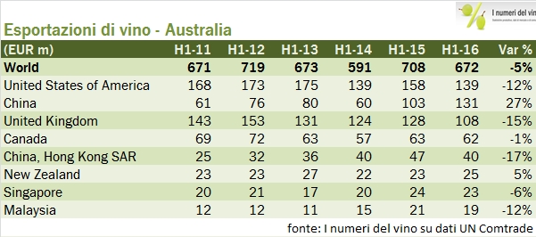 Australia – esportazioni di vino primo semestre 2016