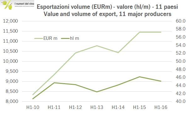 Ragioniamo oggi sul quadro delle esportazioni mondiali di vino nei primi 6 mesi del 2016, dopo aver analizzato i dati puntuali dei diversi paesi produttori. Il primo grafico vi fornisce una buona approssimazione: le esportazioni globalmente non sono cresciute, se sommiamo i dati dei primi 11 paesi produttori mondiali. Il valore esportato è stato di circa 11.4-11.5 miliardi di euro, stabile rispetto allo scorso anno (quando peraltro balzò del 10% a fronte del rafforzamento del dollaro americano), mentre i volumi esportati sono scesi del 2% a circa 45 milioni di ettolitri, dopo essersi attestati al picco storico nel semestre dello scorso anno. In questo contesto, l’andamento dell’Italia va visto in chiave positiva, anche se sappiamo bene che una volta esaurita la spinta dei vini spumanti, probabilmente il nostro export avrà qualche problema a stare al passo degli altri. Per intanto vale la pena di godersi il primato: una quota di mercato del 22.7% sul valore di questo campione di paesi, la più alta di sempre, una crescita che sfiora il 3%, la più alta tra questi paesi. Se Italia, Spagna ma anche Francia vanno bene, sono andate male le esportazioni di Australia, USA ma anche di tutti gli altri paesi. Un semestre strano, quindi, con il vecchio mondo alla riscossa… andiamo a leggere i dati insieme.