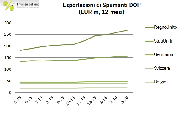 Come dicevamo qualche giorno fa, i dati del primo trimestre sono molto particolari, considerando un giorno un più (29 Febbraio) ma anche, nel caso degli spumanti, la stagionalità della Pasqua, caduta più dentro il primo che non al secondo trimestre. Detto questo, gli spumanti restano l’unico fattore di crescita delle esportazioni in questo primo trimestre, con un incremento del 21% a 230 milioni di euro. Anche nella categoria si idenfica una forte divaricazione tra gli spumanti DOP, che volano a +34%, e le altre cagorie, stabili o calanti. Ma anche tra le geografie, con Regno Unito e USA che sostengono le vendite. A tale proposito, l’andamento del referendum di questo mercoledi (23 giugno) sarà particolarmente importante per definire l’andamento dei prossimi mesi. Entriamo quindi nei dati di dettaglio.