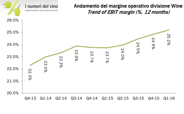 Anche nei primi tre mesi del 2016 Constellation Brands ha prodotto ottimi risultati e continuato a investire pesantemente, in linea con le indicazioni già fornite tre mesi fa. Proprio queste indicazioni, sia di investimenti che di utili, non sono state questa volta ritoccate al rialzo come invece era successo nei trimestri precedenti. La stima su fine anno è sempre di produrre utili tra 6.05 e 6.35 dollari ad azione per l’anno fiscale che termina a gennaio 2017. Venendo ai dati del trimestre, la crescita è stata del 15% sul primo trimestre 2015, con un contributo importante della birra, ma con dati positivi anche nel segmento vino, sia considerando le acquisizioni recentemente messe a segno che togliendole. Così, come già successo nei precedenti trimestri, il mercato ha accolto molto positivamente l’annuncio, con un rialzo delle azioni da circa 155 dollari al massimo storico di oltre 165. In questo momento, Constellation Brands ha un valore di borsa di oltre 32 miliardi di dollari. Andiamo a leggere i dati in dettaglio.
