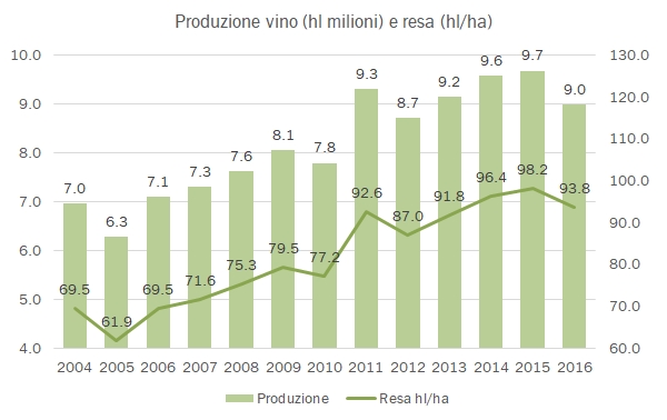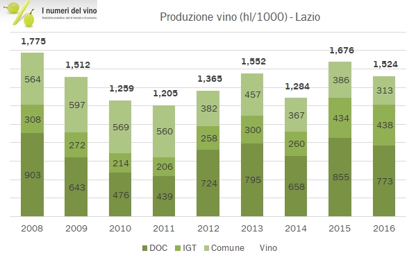 In attesa di avere i dettagli da ISTAT della vendemmia 2017, completiamo il quadro dettagliato 2016 delle regioni italiane, visto che alcune mancano ancora all’appello. Il Lazio è una di queste e mostra dei dati piuttosto negativi. Nel 2016 la produzione di vino è scesa a 1.52 milioni di ettolitri, -9% rispetto al 2015 quando invece in Italia si è verificato un incremento del 6%; infatti, la vendemmia 2016 nel Lazio è sotto la media storica in una annata considerata eccezionale. Nel 2017 probabilmente il post avrà toni simili, dato che i dati molto preliminari parlando di un calo di oltre il 30% della produzione laziale, contro una vendemmia che sembrerebbe essere a -25/30% a livello nazionale. Non tutti i numeri sono però da leggere in negativo: il Lazio continua a muoversi nella direzione del vino di qualità, con i vini comuni al minimo storico nel 2016 (21% della produzione), a fronte di una crescita dei vini IGT che ormai sfiorano il 30% della produzione. Il secondo trend è quello dei vini rossi, che storicamente in regione sono stati molto poco rappresentati e che nel 2016 salgono al 28% della produzione, il massimo da quando analizziamo i dati. Passiamo ai numeri.