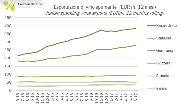 La corsa degli spumanti non si ferma. Il dato del primo semestre 2017 fa segnare +15% a 572 milioni di euro, il che porta il totale sui 12 mesi a 1268 milioni di euro, con una crescita del 18% sull’anno precedente. I dati dei nostri due concorrenti nel segmento, gli spagnoli e i francesi sono quasi altrettanto positivi, il che segnala che la categoria non è in questo periodo un driver soltanto per le nostre esportazioni. La Spagna dopo diversi anni di crescita lenta ha ripreso a correre, con un export in crescita dell’11% a 194 milioni di euro nel primo semestre. La Francia ha messo a segno un dato migliore, +13% per il comparto in totale che ha fatturato nel primo semestre 1276 milioni, quindi più del doppio di noi, con un contributo di 1144 milioni per lo Champagne (+12%) e di 132 milioni per gli altri vini spumanti (+18%). Tornando ai nostri dati, la crescita è sempre guidata dagli spumanti DOP, che sono cresciuti del 17% a 445 milioni nel primo semestre, di cui 339 milioni si riferiscono al Prosecco. I mercati forti restano i soliti, con la buona notizia che il Regno Unito dopo qualche mese di incertezza è ripreso a crescere. Passiamo ad analizzare i dati.