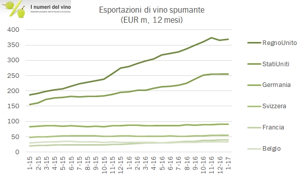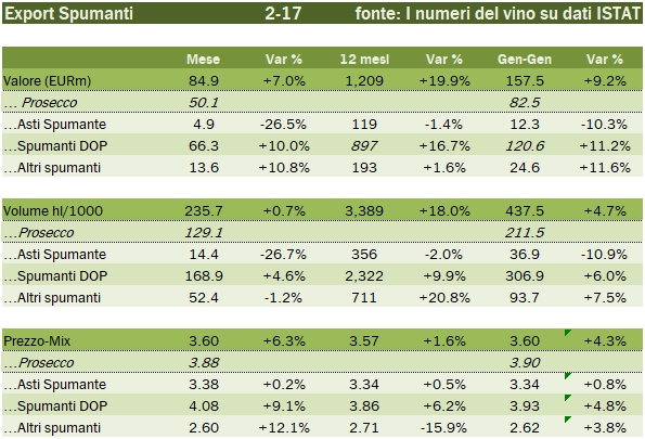 Le esportazioni di vino in Febbraio sono state stabili, probabilmente scontando il confronto dell’anno bisestile che cadeva lo scorso anno, il che comunque porta il primo bimestre a crescere del 4%. La crescita degli spumanti per ora non si ferma (+7% in Febbraio, +9% nei primi 2 mesi dell’anno) anche se cominciano a vedersi dei segnali piuttosto preoccupanti in diversi mercati importanti, primo tra tutti il Regno Unito (stabile nei primi 2 mesi dell’anno). L’anno e’ ancora tutto da scrivere, naturalmente, anche perche’ i mesi importanti per gli spumanti sono quelli nella seconda meta’ dell’anno. Di certo per ora possiamo dire che il ritmo dei primi due mesi dell’anno non e’ diverso da quello dei 12 mesi precedenti, il che non e’ male considerando che la base di comparazione diventa sempre piu’ difficile. Se poi, come sostiene Federvini, si riuscisse a vendere i nostri vini allo stesso prezzo dei francesi… beh… restiamo sui numeri che e’ meglio.