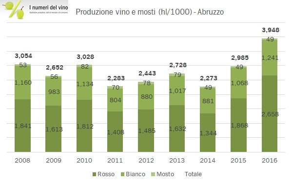 La produzione di vino in Abruzzo nel 2019 è stata in linea con la media storica (+3%) e del 7% inferiore a quella del 2018. Entrambi i dati, come abbiamo visto qualche giorno fa per la Campania, sono peggiori della media italiana, che vede un calo leggermente più marcato (-9%) ma un livello del 9% superiore a quello del 2009-2018. Nel complesso, sono più resilienti i vini bianchi dei rossi e i vini di bassa qualità (vini da tavola) rispetto ai vini DOC. L’Abruzzo mantiene una forte connotazione nelle DOC rosse (principalmente Montepulciano d’Abruzzo, il 41% della produzione di vini rossi è DOC), mentre nel segmento dei bianchi il Trebbiano fa più fatica a imporsi (solo il 14% dei bianchi è classificato DOC). Passiamo ai dati.