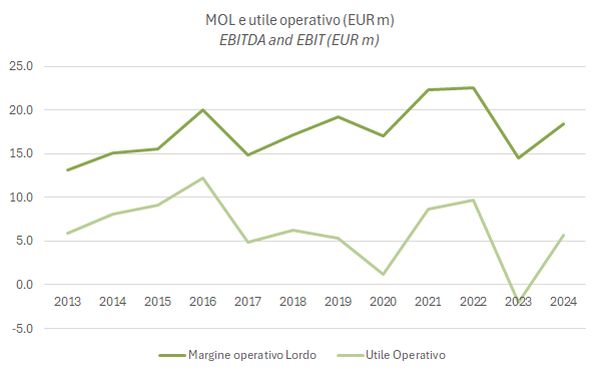 Inoltre, il debito netto è sceso di circa 15 milioni di euro a 160 milioni, piuttosto stabile rispetto ai livelli di fine 2024 (di circa 158 milioni di euro), comunque piuttosto elevati. Infatti, in rapporto al capitale proprio, il debito è pari al 217% (dal 222% del primo semestre 2024). Il debito/MOL rolling a 12 mesi è quindi sceso a 8,3 volte, abbastanza in linea con il dato medio di 8,9x degli ultimi sette anni considerando le semestrali e del 8,5x considerando diati di fine anno.