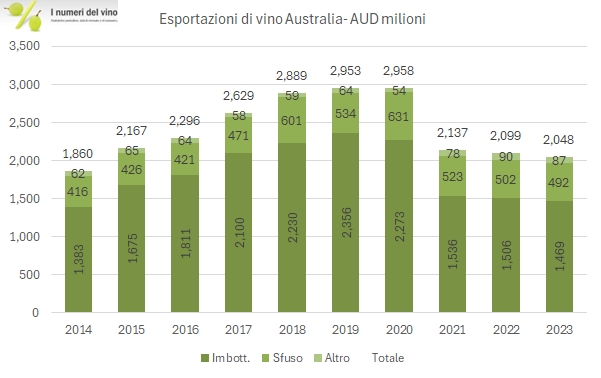 Dopo il terribile crollo del 2020 coinciso con l’applicazione di proibitive tariffe doganali in Cina, le esportazioni di vino australiano si sono assestate nell’intorno di 2 miliardi di dollari australiani, che corrispondo a circa 1.26 miliardi di euro. È il caso anche del 2023, quando il calo in valuta locale è piuttosto modesto, -2%, che diventa però -9% quando lo guardiamo con i nostri “occhi”, ossia gli euro. Guardando i numeri nel particolare si comincia a vedere che qualcosa sta capitando in Cina. Infatti, sono ripartite le esportazioni a Hong Kong e Macao, il che riporta l’export verso la “Grande Cina” a 339 milioni di dollari, sempre niente rispetto agli oltre 1 miliardo del 2020 ma comunque ben di più dei 200 milioni a cui erano arrivate nel 2021-22. È anche imminente il riesame di queste tariffe da parte del governo cinese: se fossero tolte si riaprirebbe un’opportunità per gli australiani, che però si ritroverebbero un mercato profondamente diverso da quello che hanno lasciato: infatti la Cina ha avuto un crollo delle importazioni di vino negli ultimi 2-3 anni, non soltanto per aver boicottato il prodotto australiano, visto l’andamento molto negativo del vino francese e cileno. Bene, passiamo ai dati e ai grafici, oltre a un qualche ulteriore commento.