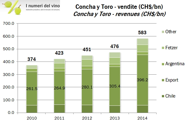 Concha y Toro ha raggiunto ottimi risultati nel 2014, continuando i progressi già visti nei risultati dei primi 6 mesi. Il forte indebolimento del peso cileno contro il dollaro, pari al 15% circa nel 2014, è tra l’altro continuato nel 2015: nel primo trimestre il peso cileno ha toccato il livello di 624 (per 1 dollaro), contro 551 del medesimo trimestre dello scorso anno e una media di 570 sull’anno. Per Concha y Toro questo significa un forte incremento del fatturato all’export in valuta locale (ma le esportazioni sono comunque cresciute di oltre il 10% in dollari americani) e, dopo anni di deterioramento, un deciso miglioramento dei margini. Diciamo che siamo a metà strada tra i tempi d’oro e i tempi bui, anche se oggi Concha y Toro oggi è molto diversa dal quella di 10 anni fa: possiede un’attività locale in USA (Fetzer), ha sviluppato un business di distribuzione di liquori in Cile e ha diversificato in nuovi mercati, appesantendo così le strutture commerciali. Oggi Concha y Toro ha raggiunto 1 miliardo di dollari di vendite, 390 milioni di dollari di margine industriale, 150 milioni di dollari di margine operativo lordo, 110 milioni di euro di utile operativo e 75 milioni di dollari di utile netto. La sua capitalizzazione di borsa il 5 aprile era 1.55 miliardi di dollari. Questo significa un multiplo sugli utili 2014 di 20 volte. Andiamo a leggere i dati insieme.