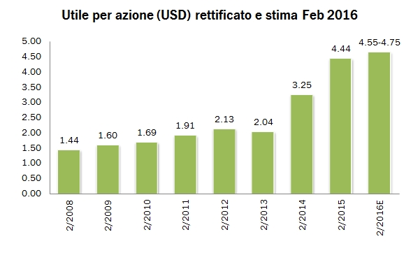 Nel 2014 (chiusura febbraio 2015), Constellation Brands ha riportato risultati ancora una volta superiori alle aspettative del mercato e alle previsioni a suo tempo effettuate. L’utile per azione è cresciuto a 4.44 dollari da 3.25, incamerando in pieno il beneficio dell’acquisizione degli interessi di minoranza della birra Corona. Nonostante il piano di investimenti colossale nell’espansione del birrificio e il debito significativo (oltre 7 miliardi di dollari), il management ha annunciato l’inizio di una politica di dividendi con pagamenti trimestrali. E’ questo un segnale a mio avviso, perchè significa che il business non dovrebbe più “sorprendere”: per tenere il titolo sui livelli da record raggiunti recentemente (120 dollari, 23 miliardi di dollari di capitalizzazione) è necessario dare qualcosa di nuovo in pasta agli investitori. E il 2015? Come detto, investimenti molto importanti (1 miliardo di dollari) ridurranno la generazione di cassa a 100-200 milioni di dollari, mentre l’utile per azione è previsto a 4.55-4.75 dollari, cioè un +3/+7% che fa circa +5% in media. Facendo un breve calcolo, con il prezzo delle azioni a 120 dollari, Constellation Brands tratta a un multiplo 2015 di circa 27 volte l’utile netto atteso. Ma passiamo a una breve rivista dei numeri, che mostrano ancora una volta la spinta della birra e la relativa stabilità del business del vino, con una decelerazione nell’evoluzione dei margini e dei volumi sulla parte finale dell’anno.