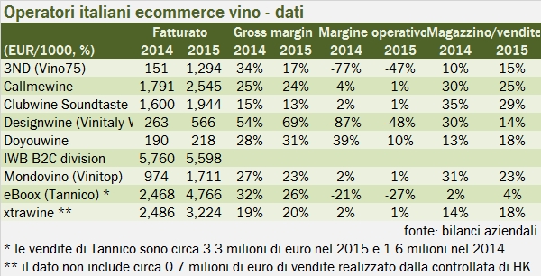 Il leader italiano di questo segmento di mercato resta Giordano/IWB con un fatturato di 5.6 milioni di euro (che però non è cresciuto nel 2015), seguito da eboox (Tannico) con 4.8 milioni di euro, di cui circa 3.3 milioni sono riferiti a Tannico e a Xtrawine con 3.2 milioni di euro di fatturato, che escludono però circa 0.7 milioni di euro generati dalla controllata di Hong Kong nel mercato locale. Rigirando i numeri probabilmente Xtrawine sarebbe davanti a Tannico, che per altro verso ha appena annunciato un rilevante aumento di capitale (EUR3.8 milioni) per continuare l’espansione fuori dai confini italiani. Il quarto operatore nazionale dovrebbe essere Callmewine, con 2.5 milioni di vendite, poi Soundtaste con 1.9 e Vinitop con 1.7 milioni.