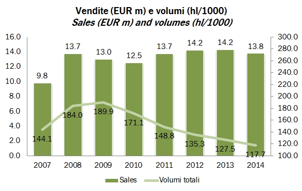 Il bilancio 2013/14 della Cantina di Castelnuovo del Garda merita di essere attentamente analizzato. La cooperativa deve far fronte a un pesante calo dei volumi trattati, dovuto da un lato alla scarsità della vendemmia 2012 e dall’altro alle decisioni di alcuni soci di interrompere la relazione con la cooperativa e affittare i vigneti a terzi. Il calo dei volumi apportati dai soci è materiale, -15%. Questo, insieme al generalo calo delle quotazioni delle uve ha determinato una significativa contrazione del prezzo che la cooperativa ha potuto garantire, 30 euro per quintale, quindi il 30% in meno dell’anno scorso. La sfida vera sembra però essere quella del 2014-15, quando oltre alla scarsa vendemmia, il management della cooperativa dovrà affrontare un vero e proprio crollo delle uve conferite, passate da 130mila quintali a 77mila quintali dalla vendemmia 2013 alla vendemmia 2014, anche a causa dell’impatto negativo di ben quattro grandinate. Certamente, la focalizzazione sui vini in bottiglia e sull’estero, entrambe in crescita, potrà essere mantenuta, ma l’equilibrio economico della cooperativa, che deve comunque ammortizzare e sostenere strutture atte a vinificare volumi ben superiori potrebbe impattare ulteriormente sulla capacità di remunerare i soci conferitori. Il rischio è di alimentare un circolo vizioso di minori volumi e minore remunerazione… ma questo lo vedremo il prossimo anno, quando la Cantina anticipa una ripresa parziale dei volumi che dovrebbero tornare a 110-120mila quintali. Per ora parliamo dei dati di questo bilancio, dove potete apprezzare tra i vari grafici la crescente quota di vini in bottiglia, che raggiungono il 47% delle vendite, e dell’estero, anch’esso al suo massimo storico, il 23% del fattturato.