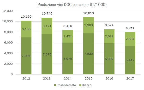 La produzione di vino cilena nel 2017 è stata la più bassa dal 2010 a questa parte, con soltanto 9.4 milioni di ettolitri prodotti. Il calo produttivo ha colpito principalmente le varietà rosse del prodotto, mentre i vini bianchi, pur in calo, raggiungono un terzo della produzione del paese sudamericano. Con volumi esportati annui di circa 9 milioni di ettolitri e un mercato interno di circa 2-3, siamo al secondo anno consecutivo di “deficit di vino” che potrebbe avere qualche impatto sui mercati internazionali. Se è vero che molti dei suoi principali concorrenti (noi inclusi) stiamo vivendo problematiche simili, è altrettanto vero che la strategia cilena è molto focalizzata sul vino sfuso e su prezzi medi piuttosto contenuti (1.8 euro al litro nel 2016, contro i 2.7 euro dell’Italia). Vedremo cosa succede. Per ora focalizziamoci sui dati 2017.