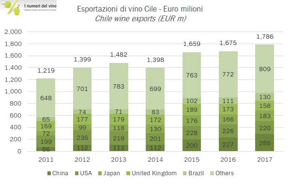 Il Cile continua a crescere sulla linea della Cina che a conti fatti rappresenta la metà dell’incremento fatto registrare nel 2017, pari al 7% espresso in euro (+8% in valuta locale). La crescita è oltretutto di qualità in quanto una buona parte dei 286 milioni di euro (e 1.4 milioni di ettolitri!) spediti nel paese asiatico sono in bottiglia. Dietro questo successo, che viene anche replicato in Giappone, Brasile e, in minor misura della Germania, si nascondono dei dati molto meno positivi. I mercati storici del vino cileno come gli USA, Regno Unito, Canada e Paesi Bassi sono in calo nel 2017 e non hanno certo brillato negli anni precedenti. Comunque, a conti fatti con 1.8 miliardi di euro e 9.5 milioni di esportati nel 2017 il Cile si conferma senza dubbio la quarta forza mondiale nel trade di vino. Le recenti vendemmie sono però particolarmente scarse: bisognerà vedere che cosa succede ai volumi di qui in avanti, perché questi 9.5 milioni di ettolitri somigliano molto al livello di produzione: ci saranno probabilmente ripercussioni sul volume dei vini sfusi esportati, che resta molto elevato a circa 4.2 milioni di ettolitri. Passiamo a leggere qualche numero insieme.