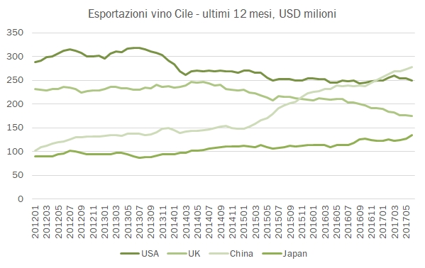 I cileni viaggiano spediti verso oriente, prendendosi quote di mercato importanti nel mercato cinese e rimpiazzando in questa maniera le perdite nel mercato inglese. Questo ci dicono i dati di UN Comtrade raccolti sulle esportazioni cilene dei primi 6 mesi 2017, in crescita del 9% in Euro a 843 milioni di euro, e del 2% in valuta locale cilena, a 602 milioni di pesos (quindi un andamento “meno” positivo quando si deve valutare gli introiti per i produttori del paese, che ovviamente ragionano nella loro valuta). Cina e Giappone sono rispettivamente il primo e il terzo mercato in questi primi 6 mesi dell’anno, e rappresentano un quarto delle esportazioni di vino del paese. Ma non è tutto oro quello che luccica: circa un terzo della crescita deriva da spedizioni massicce di prodotti sfusi verso l’Argentina, a occhio… Passiamo all’analisi dei dati.