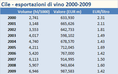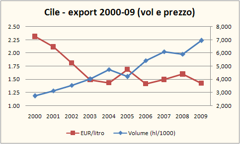1 commentoGuardiamo oggi le esportazioni cilene di vino del 2009, che sono andate in controtendenza rispetto alla maggior parte delle altre nazioni, con una crescita del 5% a valore a 1 miliardo di euro, interamente supportata da un forte incremento dei volumi a discapito del prezzo mix. I volumi esportati hanno toccato i 7 milioni di ettolitri, il massimo degli ultimi anni e probabilmente di sempre. Il vino cileno si sta sempre piu’ imponendo nel mondo ma sta sempre di piu’ prendendo una fetta di mercato precisa, quella del vino a buon mercato. Basta il colpo d’occhio ai dati pluriennali per vedere come la crescita dell’export cileno si e’ storicamente basata sui volumi: nel giro di 9 anni sono passati da 2.7 a 7 milioni di ettolitri, mentre il prezzo a cui il vino viene venduto e’ sceso da EUR2.3 a EUR1.4 al litro. Vero e’ che nel corso degli anni la valuta cilena si e’ svalutata (essendo in qualche modo agganciata al dollaro americano), ma il cambio non basta a giusticare un crollo di questa portata.