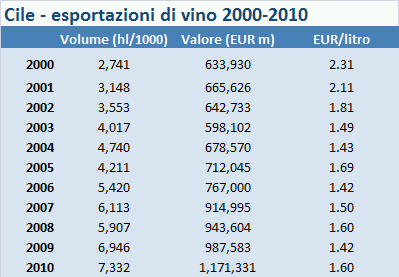 Le esportazioni di vino cileno hanno superato nel 2010 7 milioni di ettolitri, arrivando precisamente a 7.33 milioni di ettolitri. La crescita e’ stata del 6% circa, ma ci sono diversi aspetti che rendono l’andamento dell’export cileno interessante. Primo, le esportazioni di vino imbottigliato sono cresciute di piu’ che il totale: +11% a 4.3 milioni di ettolitri. In questo modo il Cile ha un po’ riequilibrato il mix delle esportazioni che negli ultimi anni era sta trainato piu’ dall’export di vini sfusi che imbottigliati (particolarmente nel 2009).