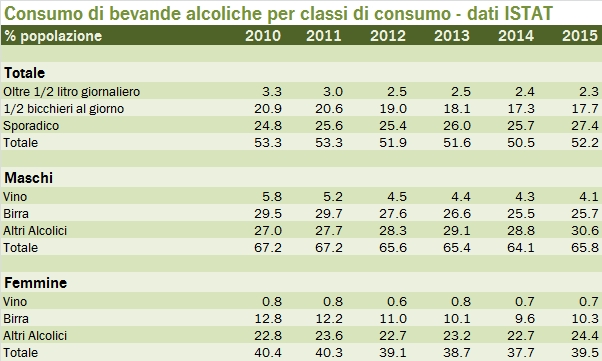 Il consumo di bevande alcoliche in Italia – aggiornamento ISTAT 2015